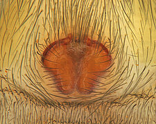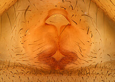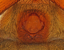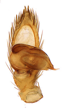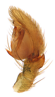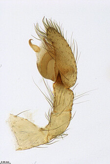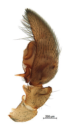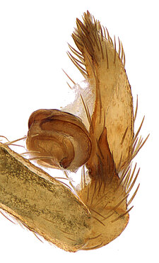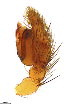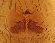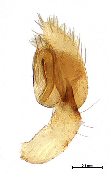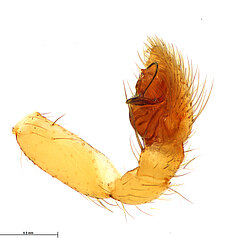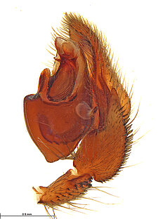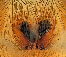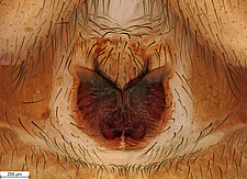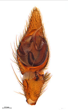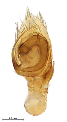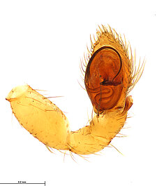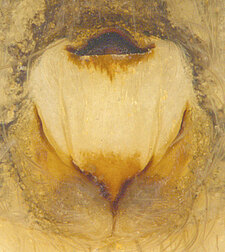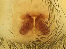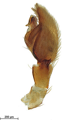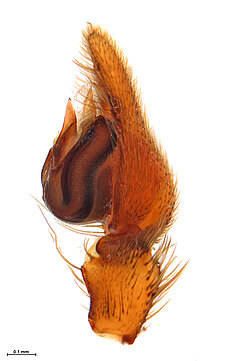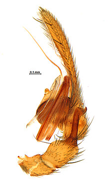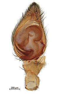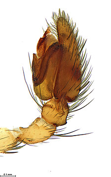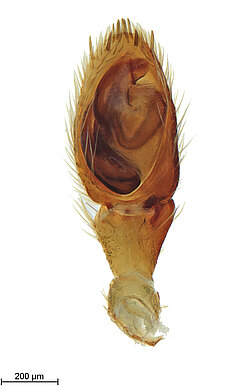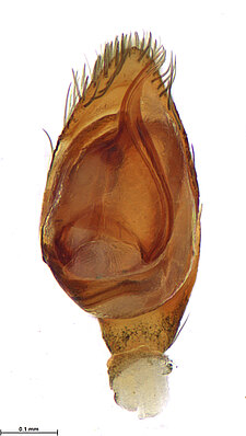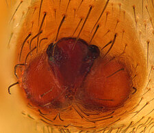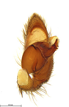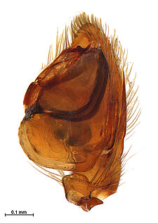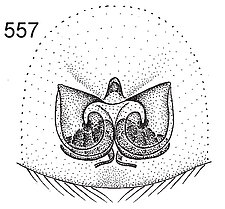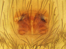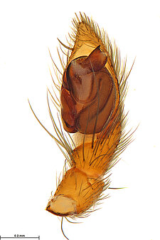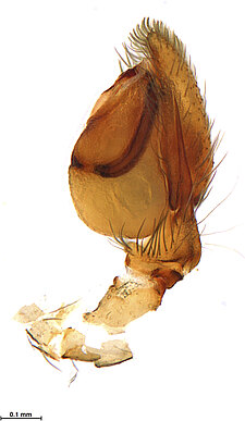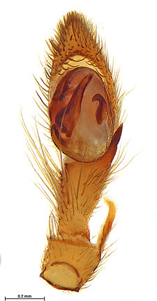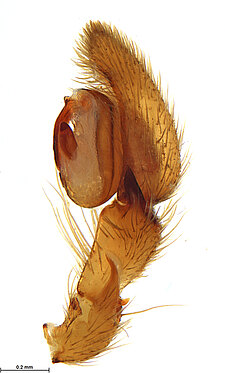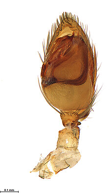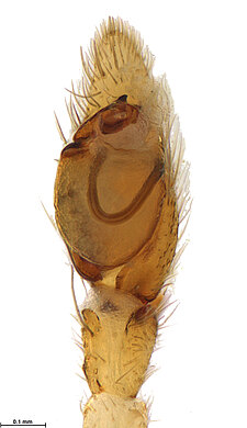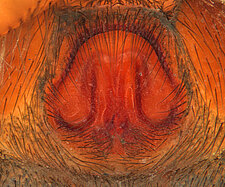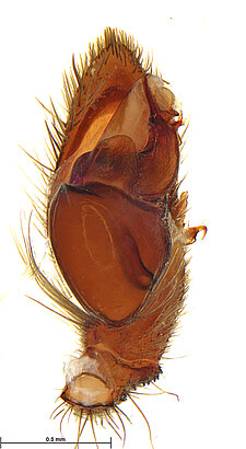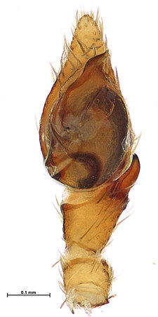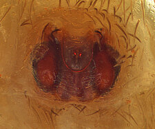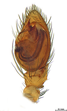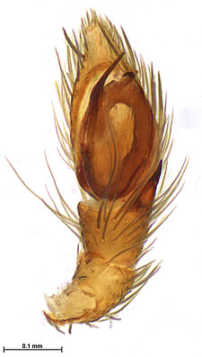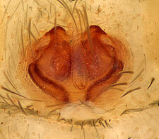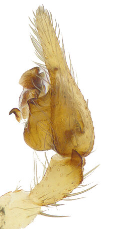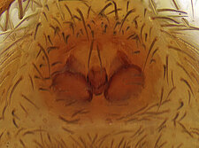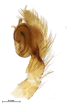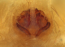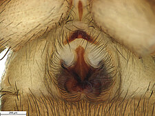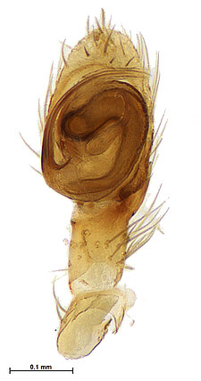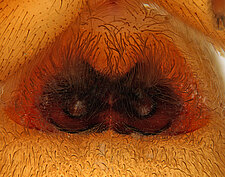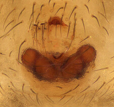 (after Framenau et al. 2014): Ground Spiders can be identified by the greatly enlarged and widened piriform gland spigots on the anterior lateral spinnerets. This microscopic character can hardly be used for the identification of these spiders in the field. However, these spiders generally have cylindrical anterior spinnerets that are separated by at least their diameter and ovoid silvery posterior median eyes. The outer edge of the maxillae, where the pedipalps emerge, are generally noticeably indented.