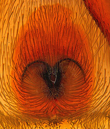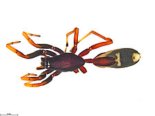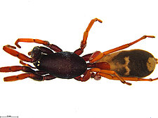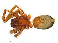 (after Platnick 2000): The Lamponidae (White-tailed Spiders) differ from ammoxenine gnaphosids, cithaeronids, gallieniellids, and trochanteriids in having anterior lateral spinnerets consisting of only a single article, and from gnaphosids (incl. molycriines) in having an incomplete ring of sclerotized cuticle (rather than just a tiny crescent) that represents the remains of the base of a distal article. Most lamponids are easily recognized by the pair of large, oval, invaginated sclerites situated just behind the epigastric furrow in both sexes, but these sclerites are inconspicuous in the small species of the subfamily Pseudolamponinae.