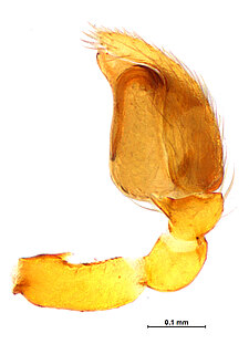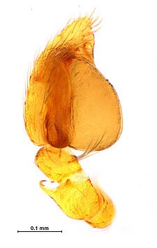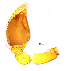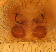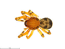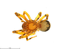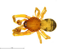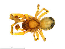 (after Ramírez 2014): Trachelidae is supported by the following six synapomorphies: spination on legs III–IV reduced, absence of scales, absence of epiandrous spigots, number of major ampullate glands in female reduced to one, median apophysis absent, and secondary spermatheca (enlargement of the copulatory duct) about as large as the primary ones.