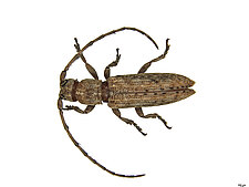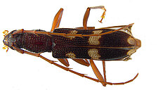 (after Hangay & Zborowski 2010): Cerambycids are distinctively elongate, cylindrical, subcylindrical or flattened, and range from 5-80mm in length. Their heads are exposed and can be prognathous or hypognathous. Antennae are usually 11-segmented, rarely with 10 or more than 20 segments, and span at least two-thirds of their body length. Antennae are inserted on prominences on the emargination of the eyes. Eyes usually kidney-shaped, mandibles often enlarged and prominent, pronotum usually moderately convex and elytra usually cover the entire abdomen, with most species being fully winged. Tarsal formula 5-5-5, mostly appearing 4-4-4 (pseudotetramerous tarsi).