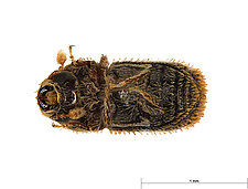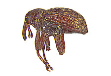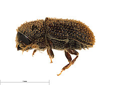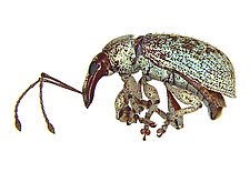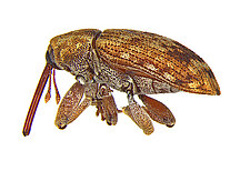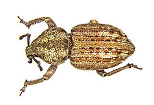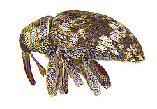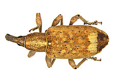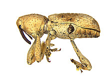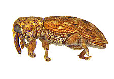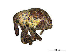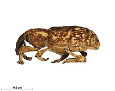 (after Hangay & Zborowski 2010): Weevils have a diverse array of body shapes, but are generally convex with a strong and hard exoskeleton, often possessing scales and bristles. They can be 1.5-65mm in length, but are usually less than 15mm long. The head usually has a forward or downward projecting rostrum, ranging from short and broad to narrow and long. The antennae are almost always elbowed, with a long scape and a 3-segmented club. The first two ventrites are fused and the tarsal formula is 5-5-5, but appears as 4-4-4.