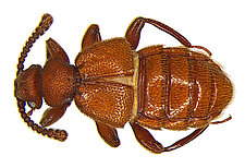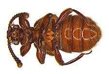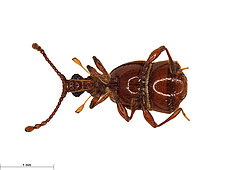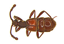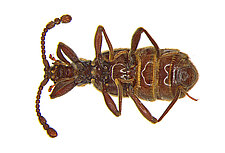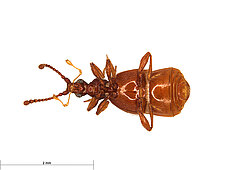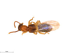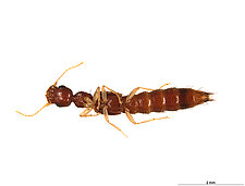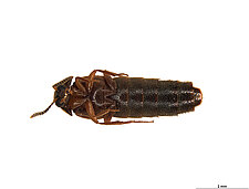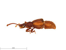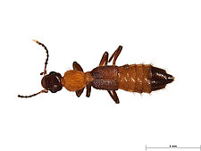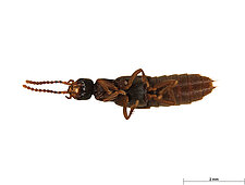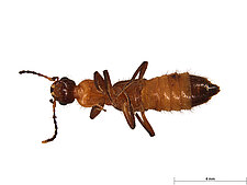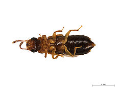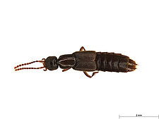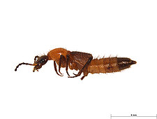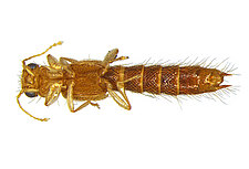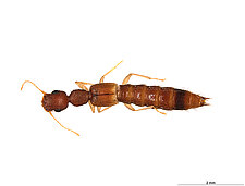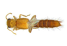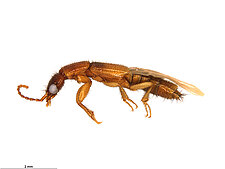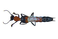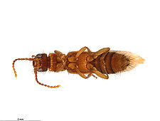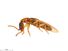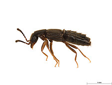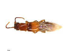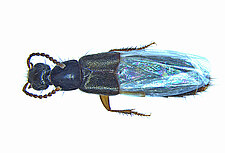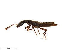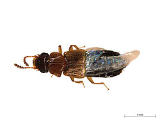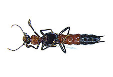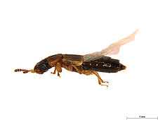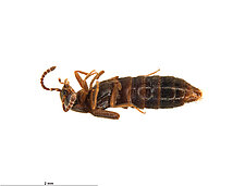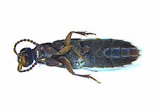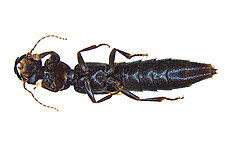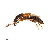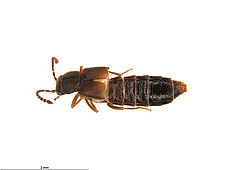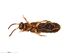 (after Hangay & Zborowski 2010): Staphylinids are mostly narrow and elongate beetles, roughly 0.5-20mm in length. Their elytra are typically very short, leaving more than half of the abdomen exposed. They are mostly dark in colour, while some are metallic or brightly coloured.