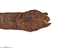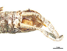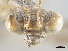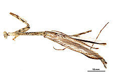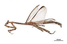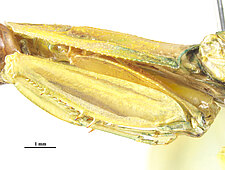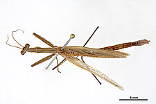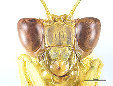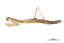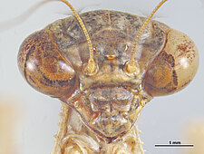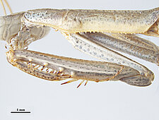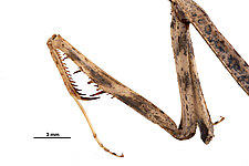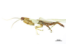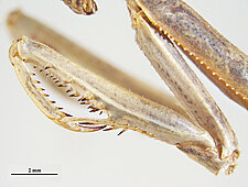 (after Schwarz & Roy 2019): Mantidae can be distinguished from all other mantodeans by the following combination of characters: vertex without process, if with small process than anterior femora with dorsal lobe and walking leg femora with very large ventral lobes; eyes rounded or slightly conical; juxtaocular bulges indistinct; frontal shield not keeled medially; ocellar tubercles usually missing, if present then legs with several sets of lobes or female tegmina with two large oblique markings; pronotum simple, sometimes with a foliaceous expansion; supracoxal dilatation well marked, but may be obscured by foliaceous expansion; metazona at least 2 times as long as prozona; apical lobes of forefemur at most with a very short spine; forefemora with 3–4 discoidal and 4 posteroventral spines, without distinct crenulation medioventrad posteroventral spines; posteroventral spines of foretibiae not decumbent; walking legs sometimes with subapical ventral lobes; males mesopterous to macropterous, females macropterous to brachypterous; cyclopean ear present; supra-anal plate wider than long, more or less triangular; cerci shorter than half of abdomen length, mostly cylindrical, rarely flattened; phallomeres sclerotized; processes of left complex separated; ventral phallomere with or without a basal lobe on right side; pda translocated to left side of ventral phallomere; sdpm or sdpl present, often both; if sdpm is the main process then phalloid apophysis usually short and simple, if sdpl is the main process then phalloid apophysis strongly bifid; apical process sometimes with subapical tooth; dorsal lamina of left phallomere without a rounded lobe along left margin.