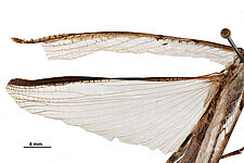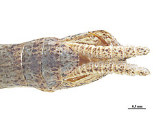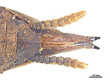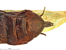 Elongate body form, pronotal margins denticulate, female strongly brachypterous, anal area of hind wing partially to completely opaque smoky black, cerci cylindrical.