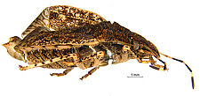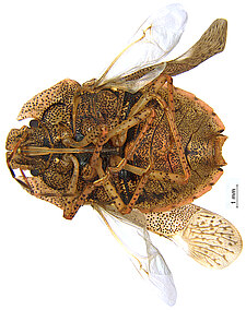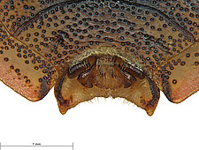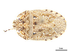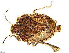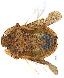 (after Gross 1976): Rather oval and moderate-sized Pentatominae, reddish-brown, yellowish-brown, or blackish-brown in colour. Head rather large, apically flattened or even concave. Juga laterally expanded, produced well in front of the anteclypeus, their anterior margins rounded or truncate, their lateral margins sometimes produced into a prominent lobe or spine in front of the eyes. Antennae slender. Pronotum rather flat, the anterior margin strongly concave, the lateral margin explanate and produced into a flattened angulate or lobate process which reaches forward to at least the posterior margin of the eye and lies just exteriorly of the true anterior angle. Behind this the anterolateral margins may be expanded laminately, frequently crenulate or serrate. Scutellum substantially triangular and somewhat larger than usual in Pentatominae. Hemelytra always wider than the abdomen in their basal half, generally narrowing apically. Laterotergites unarmed. Beneath the bucculae do not reach the base of the head, the prosternum is shallowly depressed, the mesosternum is a little convex and has a median longitudinal raised line or flattened ridge. The pygophore of the male has a characteristic posterior V-shaped or arcuate raised ridge below.