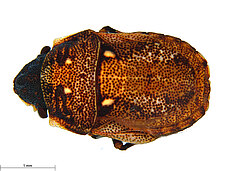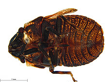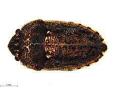 (after Gross 1975): Body ovate, moderately convex; head broader than long, large, flattened above, almost as long as the pronotum, lateral margins somewhat convex, acute, juga very broad. Eyes large and directed a little upwardly and backwardly. Pronotum twice as wide as long, anterior margin straight, lateral margins also almost straight and diverging posteriorad, posterolateral margins slightly convex, hind margin straight. Scutellum almost reaching apex of abdomen, considerably longer than broad, lateral margins nearly straight, divergent only anteriorly, apex broadly rounded. Outer margin of corium exposed for all its length outside of scutellum. Beneath rostrum reaching to hind coxae, all sterna sulcate but relatively shallowly so and prosternal sulcus without raised lateral margins.