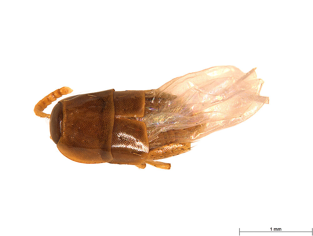 Head, pronotum and elytra dark brown; abdomen, legs and antennae yellow brown. Head entirely encapsulated by pronotum, which wraps around head and thorax, and partialy overlaps elytra. Few sparse but long setae present on pronotum and elytra.