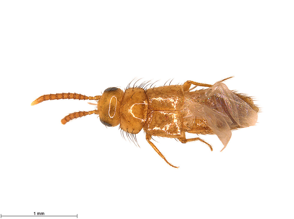 Small, yellow species with long setae present on the lateral margins of the pronotum. Pronotum 1.5 times wider than long.