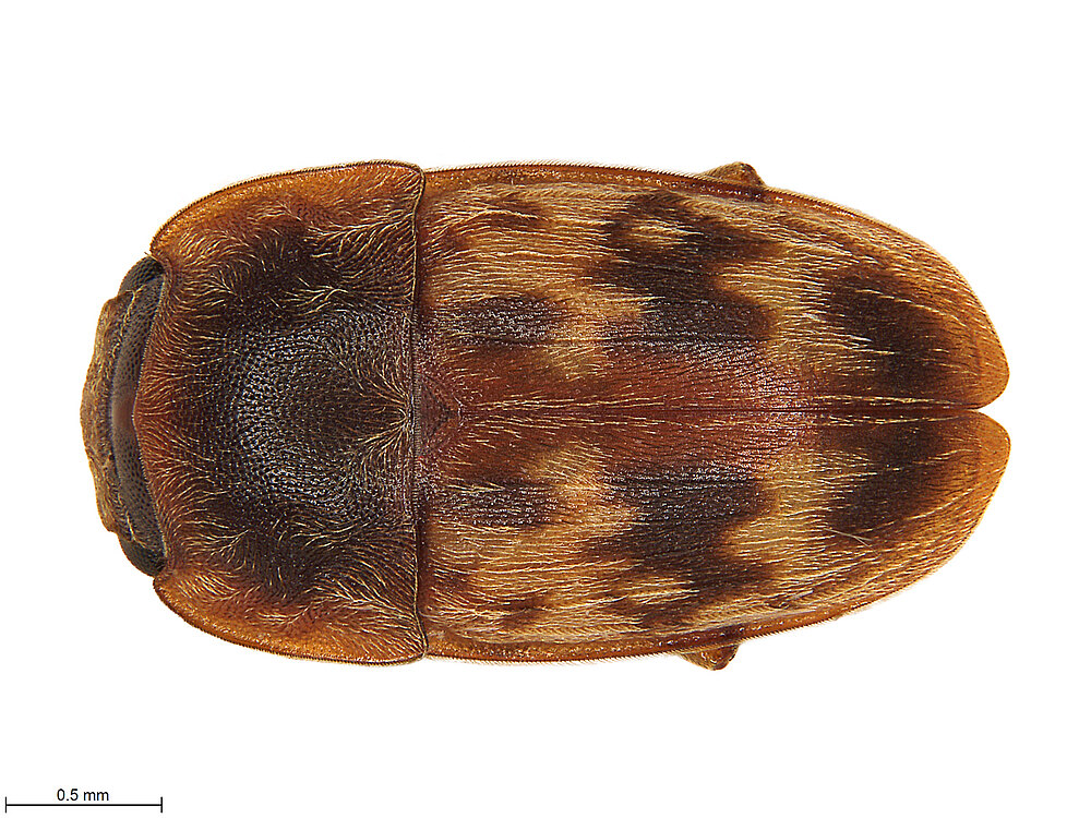 A distinctive brown beetle with lighter patches on the elytra. The pronotum is greater in width than the elytra, which tapers distally. The margin of both the pronotum and elytra are flattened into a carina.