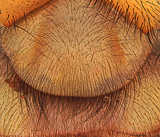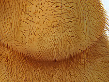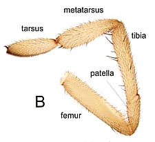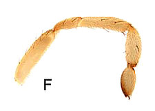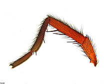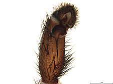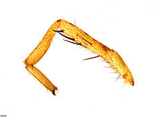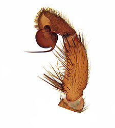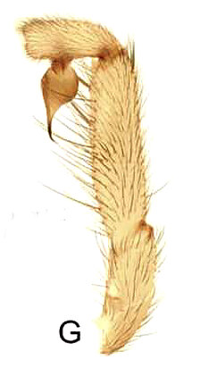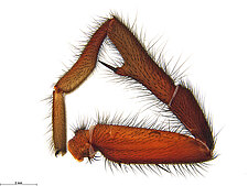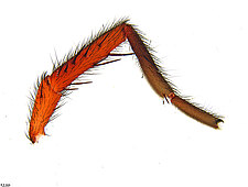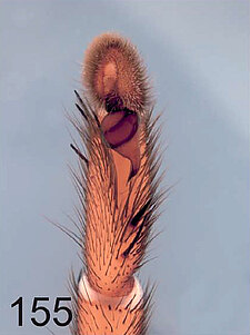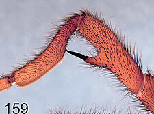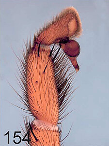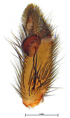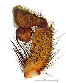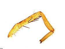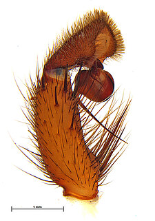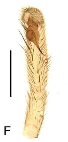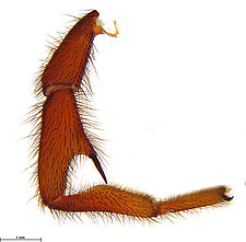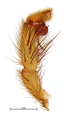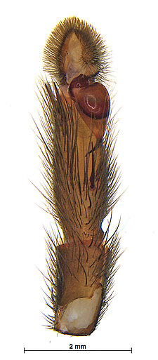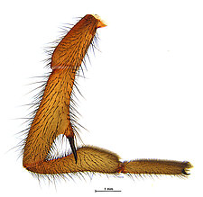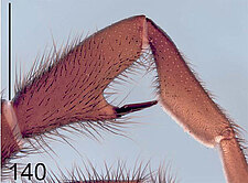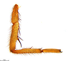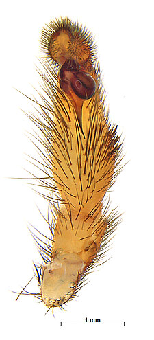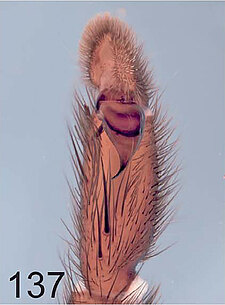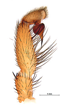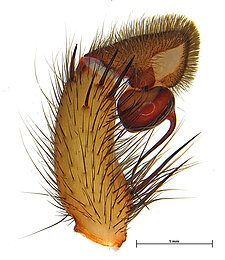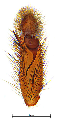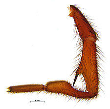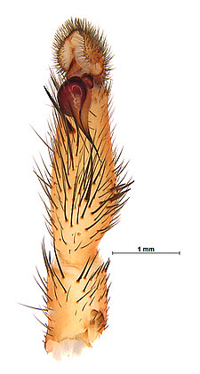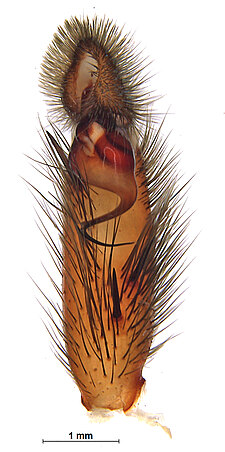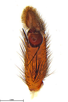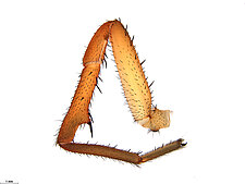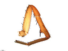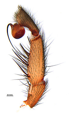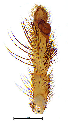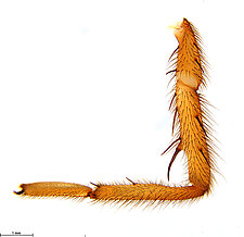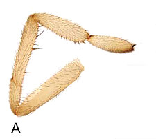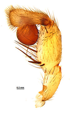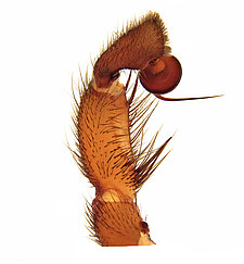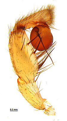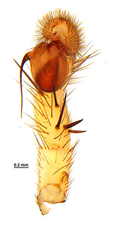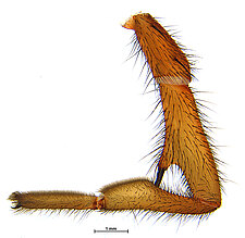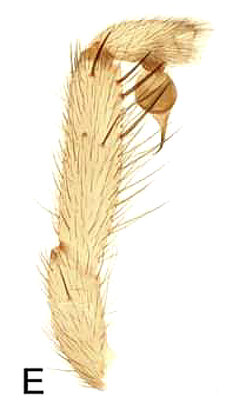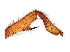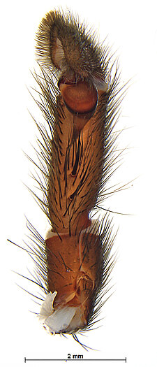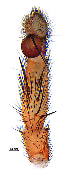 Males with an inflated tarsus of the first leg that carries a ventral pad of short, stubby, spine-like bristles forming a brush.