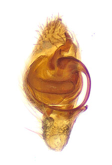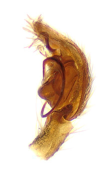 Males with slender embolus base directed posteriorly, with embolus thin along prolateral diameter of bulb and lying in same line as the long, slender median apophysis; and the retrolateral tibial apophysis consisting of two trianguloid plates restricted to the base of the cymbium, each joined by unsclerotised zone.