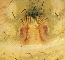 Tuxoctenus has a pair of longitudinal ridges of white hairs on an otherwise dark carapace and abdomen.