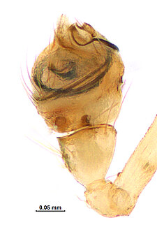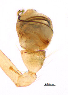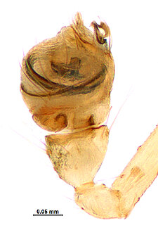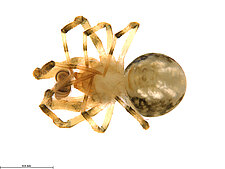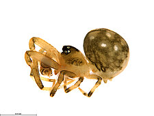 (after Framenau et al. 2014): The Minute Clasping-weavers (family Mysmenidae) include tiny symphytognathoid spiders. Males have a clasping spine on the metatarsus and/or the tibia of the first leg and females have a characteristic dark dot on the proximal-ventral surface of the first femur. In addition, the eyes of males are often elevated on long turrets. The soft abdomen is higher than long and often has an elevation or extension protruding from the back.(after Framenau et al. 2014):