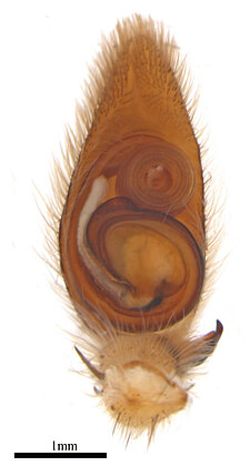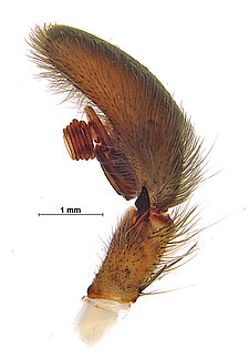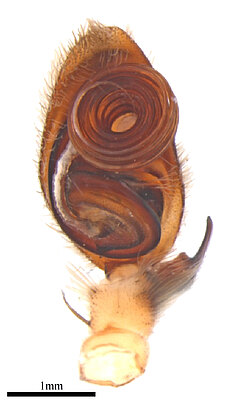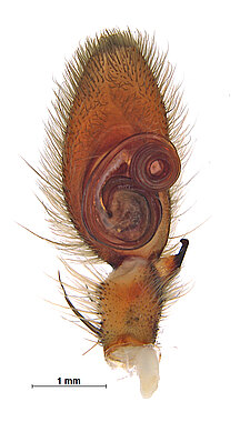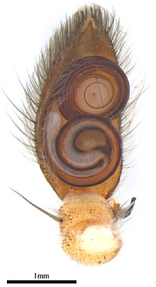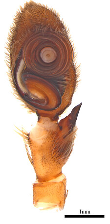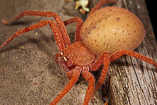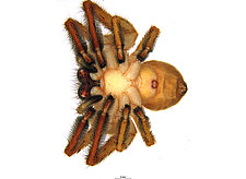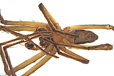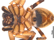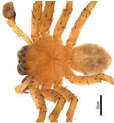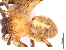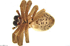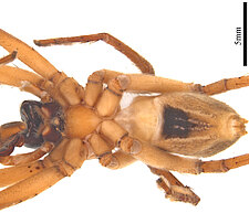 (after Framenau et al. 2014): The Huntsman Spiders (family Sparassidae) belong to one of the most distinctive groups of the Australian spider fauna. Huntsmen spiders are generally large spiders with flat body and crab-like (‘laterigrade’) arrangement of the legs. This morphology is perfectly adapted to their natural habitat, which is a life under the bark of trees or in small crevices under rocks. They have dense pads of hair on the ends of their legs, which allow them to easily climb almost any vertical surface. They may even be seen scuttling on a ceiling.