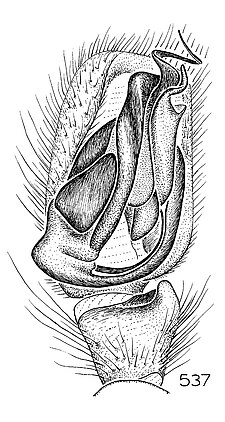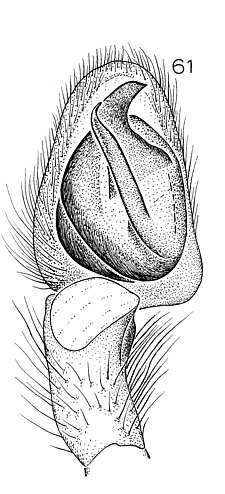 Retrolateral tibial apophysis of male pedipalp enormously elongated, extending almost to the tip of the palpal cymbium. Females with concomitant elongation of the epigynum, with an anterior hood situated just behind the pedicel, and separated from the remainder of the epigynum by easily extensible cuticle.