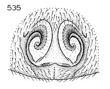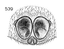 Enlarged anterior eyes on distinct mount; males with completely coiled tip of median apophysis, females with coiled ducts.