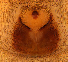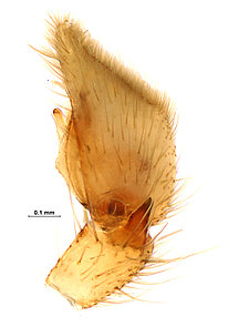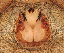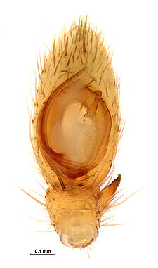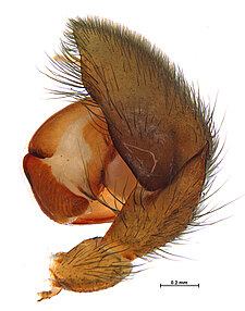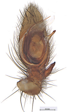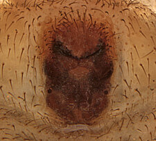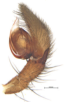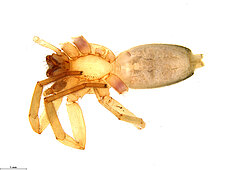 (after Azavedo et al. 2022): Trochanteriidae can be diagnosed by an extremely flat carapace, with a reflexed border; a flat posterior median eyes lens that is contiguous with carapace cuticle; by a clypeus produced in a median lobe; laterigrade legs; absence of claw tufts; anterior lateral spinnerets with incomplete distal article and with inflatable area; and epigynal field formed by a divided plate.