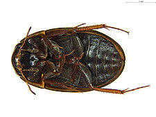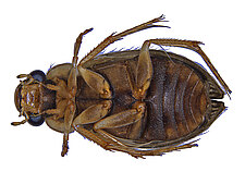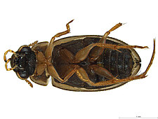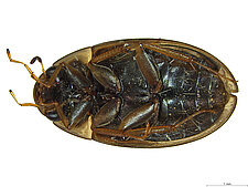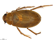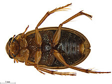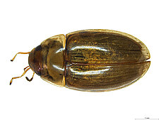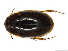 (after Hangay & Zborowski 2010): Hydrophilids are shaped like an inverted boat, with a convex dorsal surface while being flat below. They are usually dark in colour or olive-brown, sometimes reddish or black, rarely metallic, and are 1-40mm in length. Their antennae are 7-9 segmented, short, with a 3-segmented club, cupuliform, with maxillary palps usually longer than their antennae. The metatarsum are often keeled with a sharp spine at the rear, and their hind tarsi are often flattened and equipped with thick setae. Their tarsal formula is 5-5-5, rarely 4-4-4.