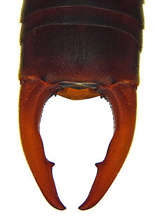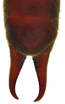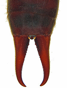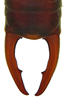 (after Kočárek 2006): Representatives of the family Labiduridae are medium-sized to very large earwigs (7–70 mm total length) with a stout and usually not depressed body. They have characteristic, distally slightly elongated second tarsal segments with the third segment articulated on their ventral surface; hence the tarsal segments are not scapiform. Male genitalia have two functional lobes; the parameres have a large or small epimerite (sometimes absent); the virga are stout, tubular, at base sometimes with a vesicle or only a dilatation, and with a sinuous tube throughout their entire length or only at base.