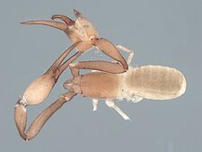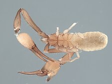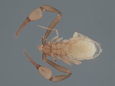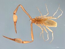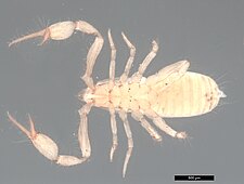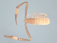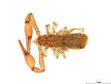 Differs from the only other genus of the family, Hya, by the absence of venom glands in the fixed chelal finger and the juxtadentate teeth of the chelal fingers.
